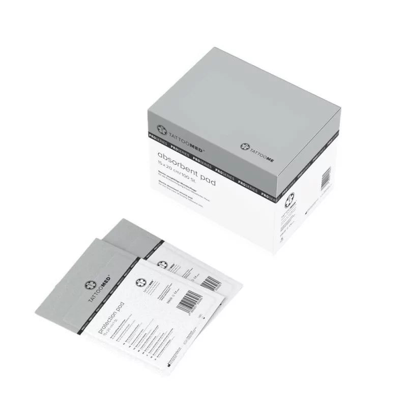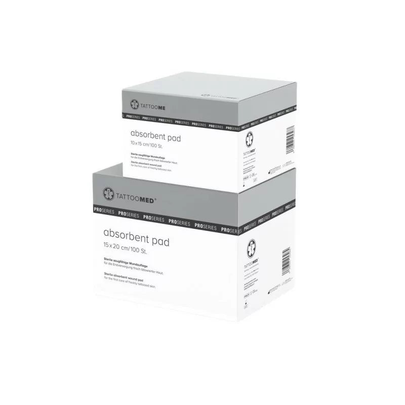 TattooMed Absorbent Pad è una medicazione sterile professionale progettata per la cura iniziale cruciale della pelle appena tatuata. Disponibile nelle misure 10x15cm o 15x20cm, ogni confezione contiene 100 garze altamente assorbenti, ideale per studi e routine di aftercare.