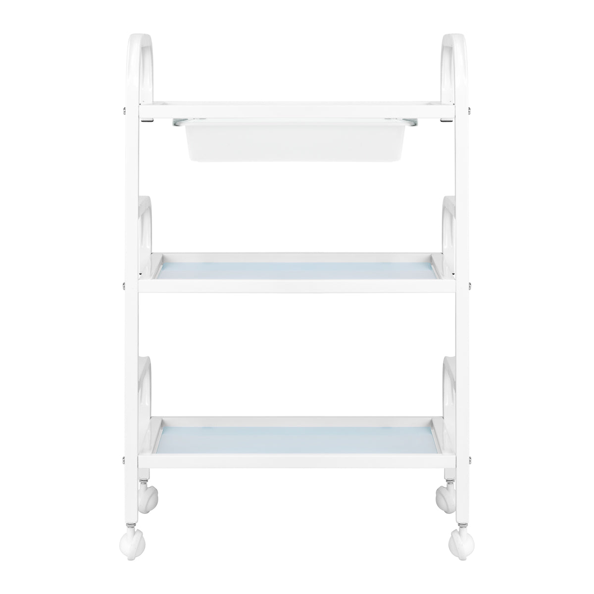 Il tavolo cosmetico Basic 121 è un mobile funzionale che si adatta perfettamente a qualsiasi salone di bellezza o centro benessere. La struttura leggera facilita il lavoro quotidiano, mentre tre ripiani in vetro offrono un comodo spazio per riporre cosmetici, accessori e attrezzature. Un vassoio aggiuntivo sotto il ripiano superiore permette un rapido accesso agli strumenti più usati. Il design essenziale conferisce un aspetto professionale all’ambiente.