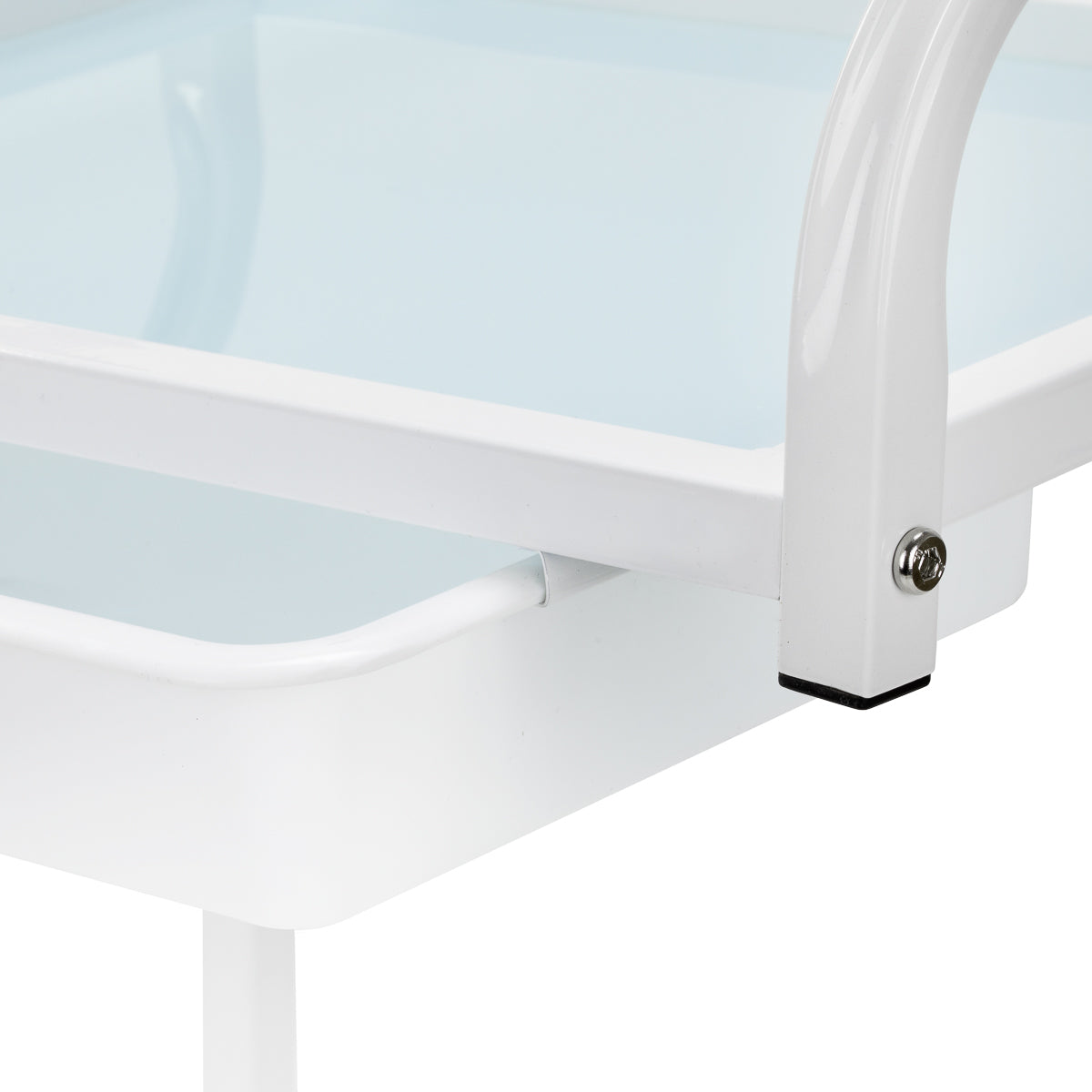 La struttura in alluminio resistente nelle tonalità del bianco e i ripiani in vetro creano un insieme moderno ed elegante facile da mantenere pulito. Quattro ruote garantiscono la mobilità per organizzare facilmente lo spazio di lavoro, mentre materiali solidi assicurano stabilità e durata nel tempo.