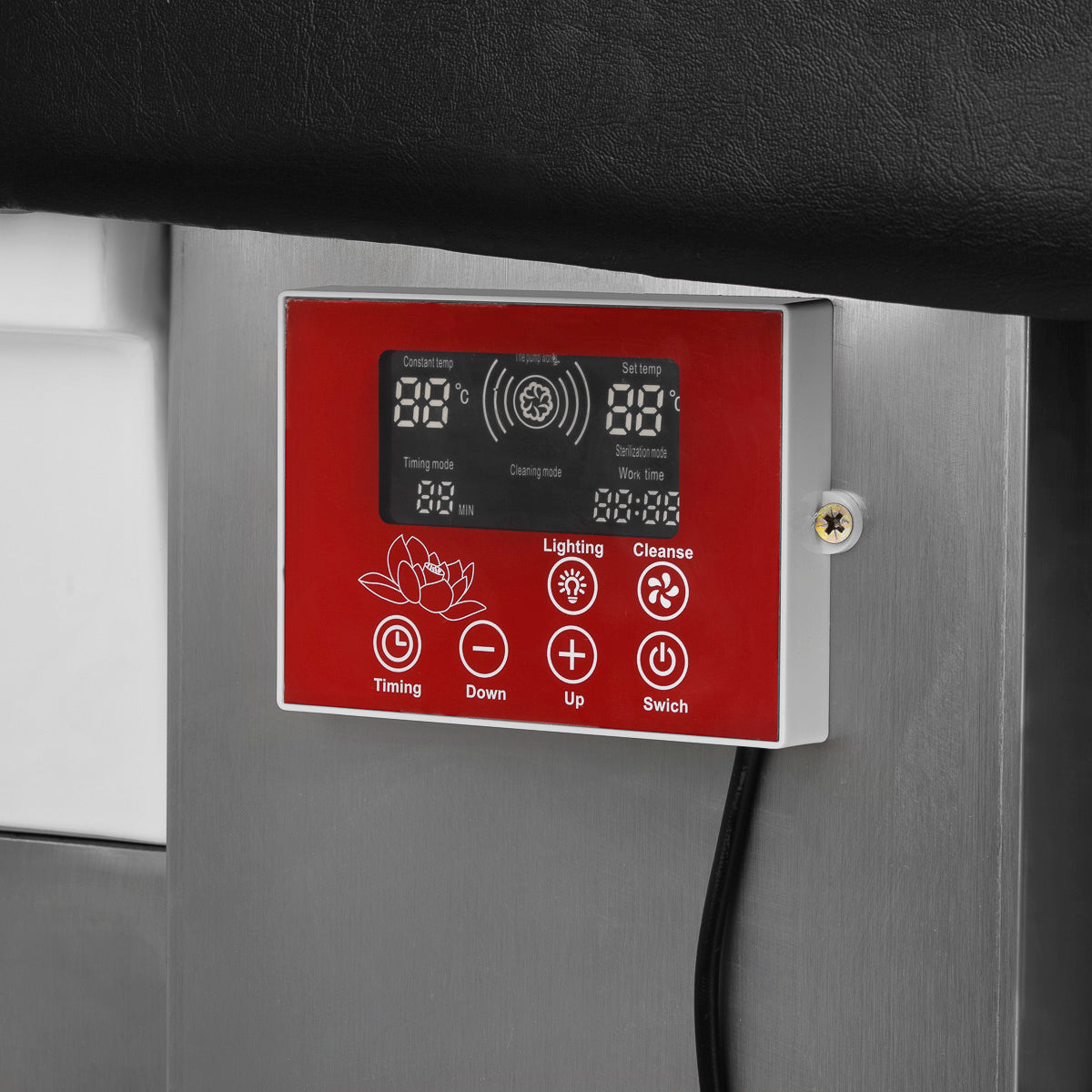 Il pannello touch intuitivo fornisce il controllo completo sulle funzioni dell'unità di lavaggio. Permette di regolare il tempo di funzionamento e la temperatura dell'acqua, oltre a monitorare i loro valori attuali. Grazie al display integrato, è possibile verificare in qualsiasi momento da quanto tempo il dispositivo è in funzione. Il pannello consente anche di attivare la funzione di terapia della luce, cioè l'illuminazione della ciotola, creando un'atmosfera di relax e lusso. Inoltre, il dispositivo per la terapia a vapore è dotato di un telecomando, che consente un comodo funzionamento a distanza.