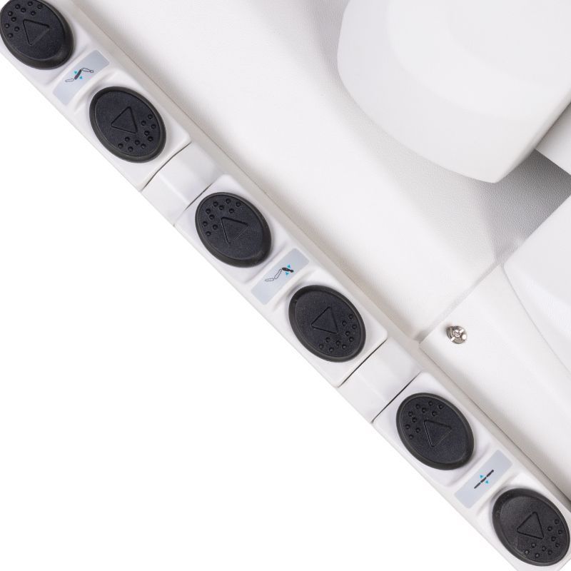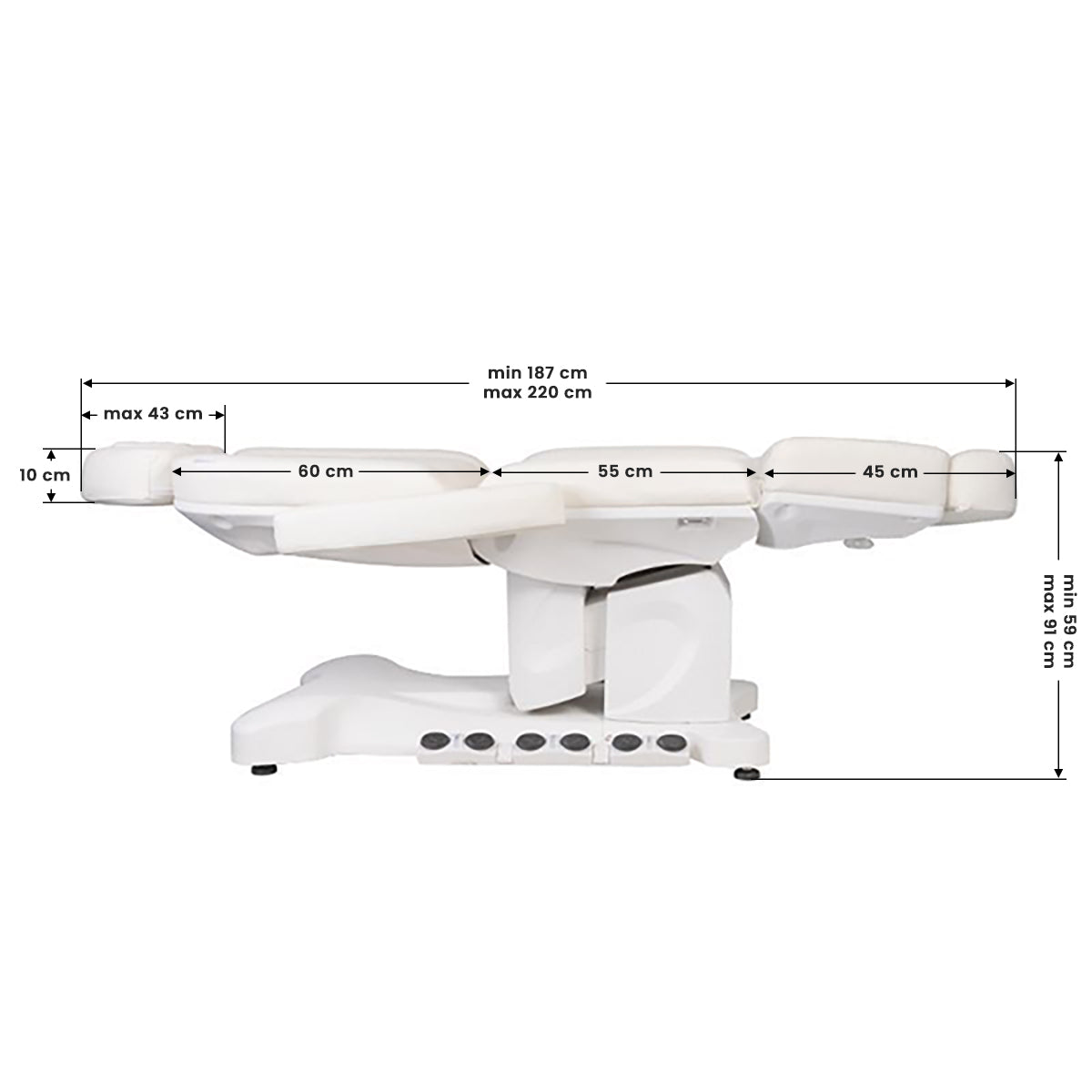 Una poltrona cosmetica elettrica unica, ideale per saloni di bellezza e SPA. Grazie ai motori indipendenti, permette di regolare la poltrona su 4 piani tramite un telecomando e pedali, offrendo la possibilità di trattamenti facciali e corporei confortevoli. Utilizzando il telecomando, possiamo utilizzare le impostazioni programmate e avviare la funzione HOT, cioè il riscaldamento. La poltrona utilizza un rivestimento traforato, mai visto in altre poltrone, e un'illuminazione a LED colorata della base.
