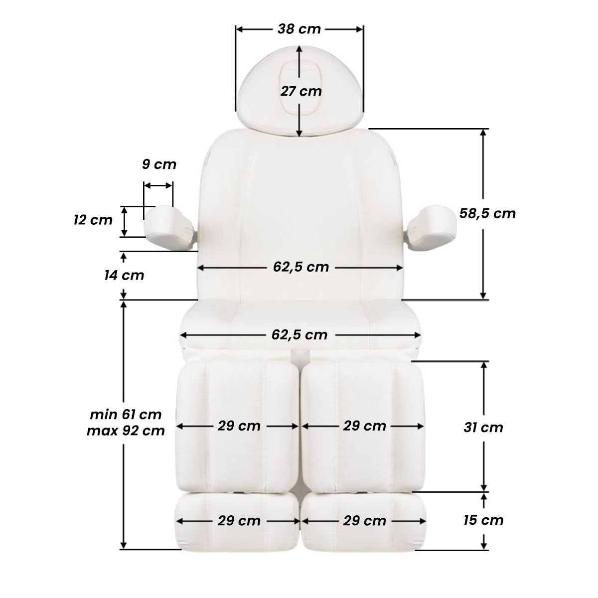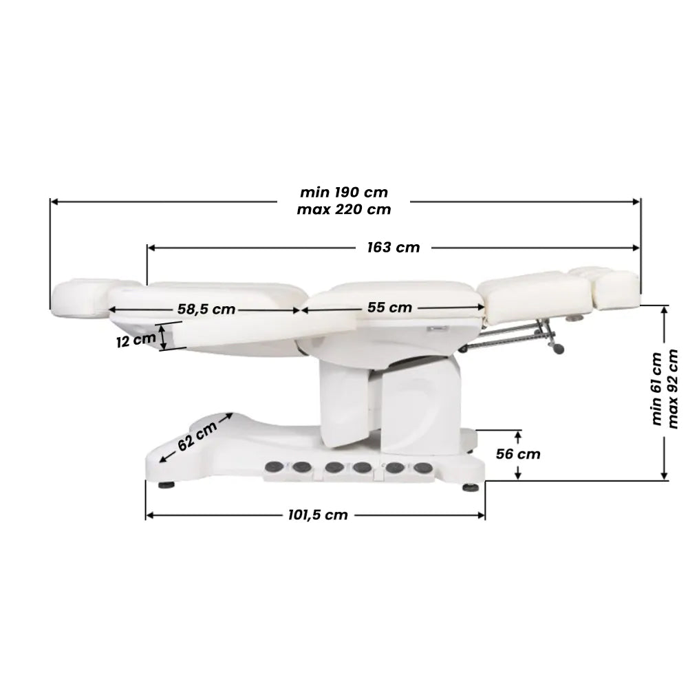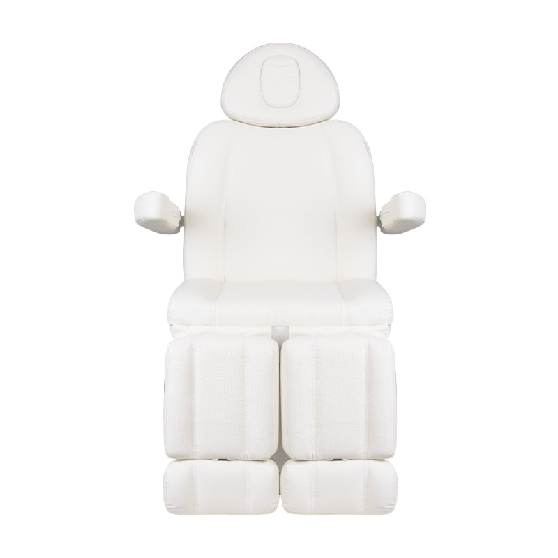 Una poltrona cosmetica elettrica unica, ideale per saloni di bellezza e SPA. Grazie agli attuatori indipendenti, permette di regolare la poltrona su 3 piani tramite un telecomando e pedali, offrendo la possibilità di trattamenti pedicure confortevoli così come trattamenti viso e corpo. Utilizzando il telecomando, possiamo usare le impostazioni programmate e avviare la funzione HOT, cioè il riscaldamento. La poltrona utilizza un rivestimento traforato, mai visto in altre poltrone, e un'illuminazione a LED colorata della base.