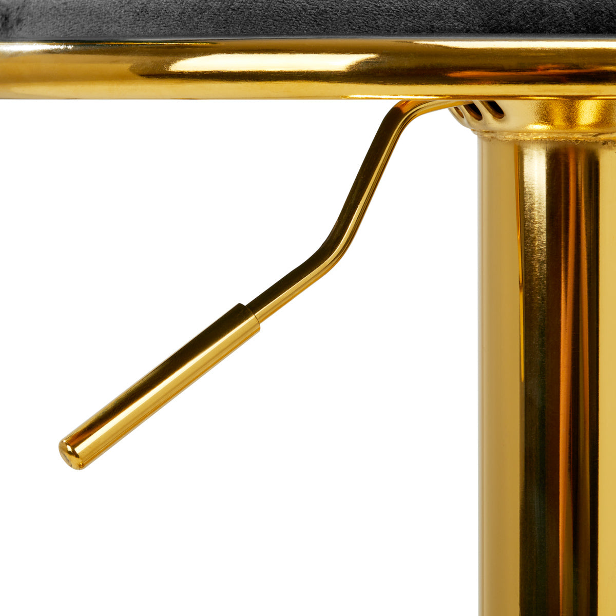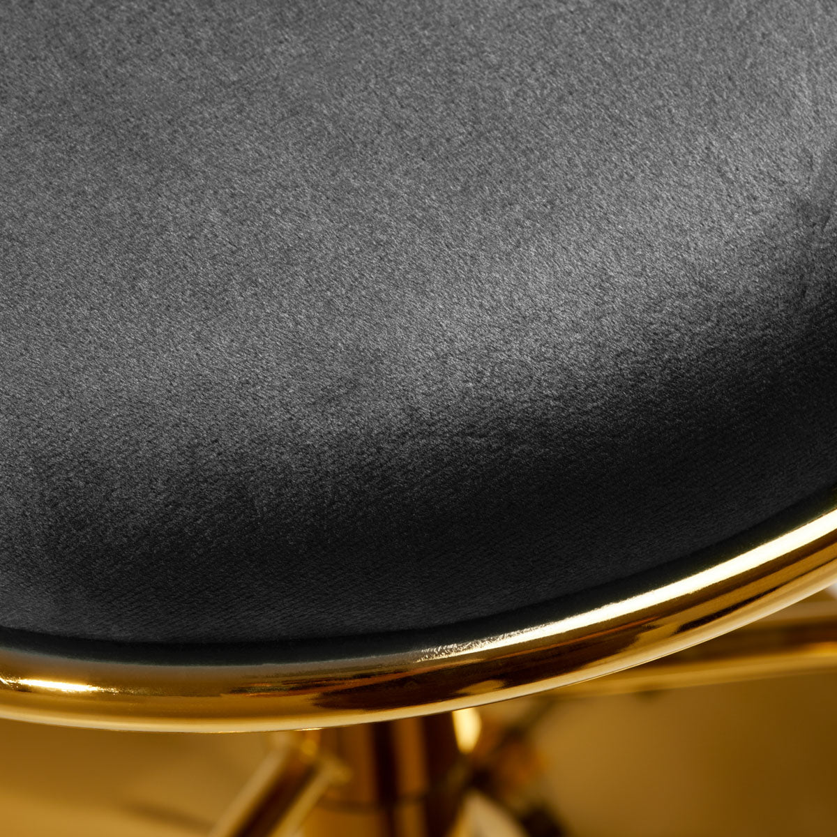 Rivestimento in velluto piacevole al tatto in tonalità di grigio conferisce allo sgabello un carattere unico, e il tessuto esteticamente intrecciato sullo schienale enfatizza l'aspetto unico del mobile. La finitura rende il mobile accattivante. La struttura in tonalità dorate aggiunge eleganza e prestigio, abbinandosi perfettamente al velluto.