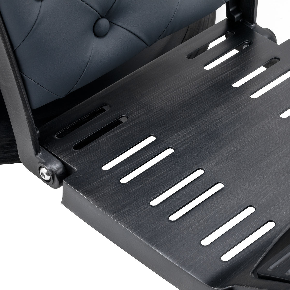 La struttura stabile della base con elementi in tonalità di nero garantisce un alto comfort d'uso. L'imbottitura con schiuma durevole e resistente alla deformazione e la tappezzeria in pelle sintetica piacevole al tatto assicurano la durata del mobile e il suo utilizzo confortevole per lungo tempo. Rendono inoltre l'attrezzatura resistente all'umidità, durevole e facile da pulire. La copertura in tonalità di grafite insieme alla trapuntatura originale e ai bottoni decorativi le conferiscono un carattere unico. Gli elementi decorativi di design ispirati alle motociclette, che richiamano lo stile vintage, si adattano perfettamente all'atmosfera delle barberie, creando la loro straordinaria aura.