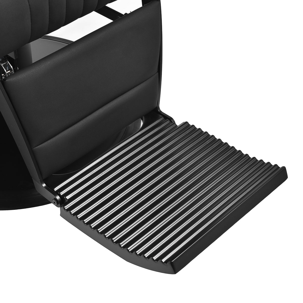 La base nera e rotonda garantisce stabilità e durata. L'imbottitura in pelle sintetica opaca e morbida combina comfort e resistenza. I materiali utilizzati sono resistenti all'umidità, durevoli e facili da pulire. Cuciture eleganti e un rivestimento tono su tono nero conferiscono un carattere unico, che si integra perfettamente con l'arredamento dei moderni barber shop. La combinazione del colore elegante del rivestimento con la struttura e la base nere evidenzia l'aspetto moderno e professionale della poltrona.