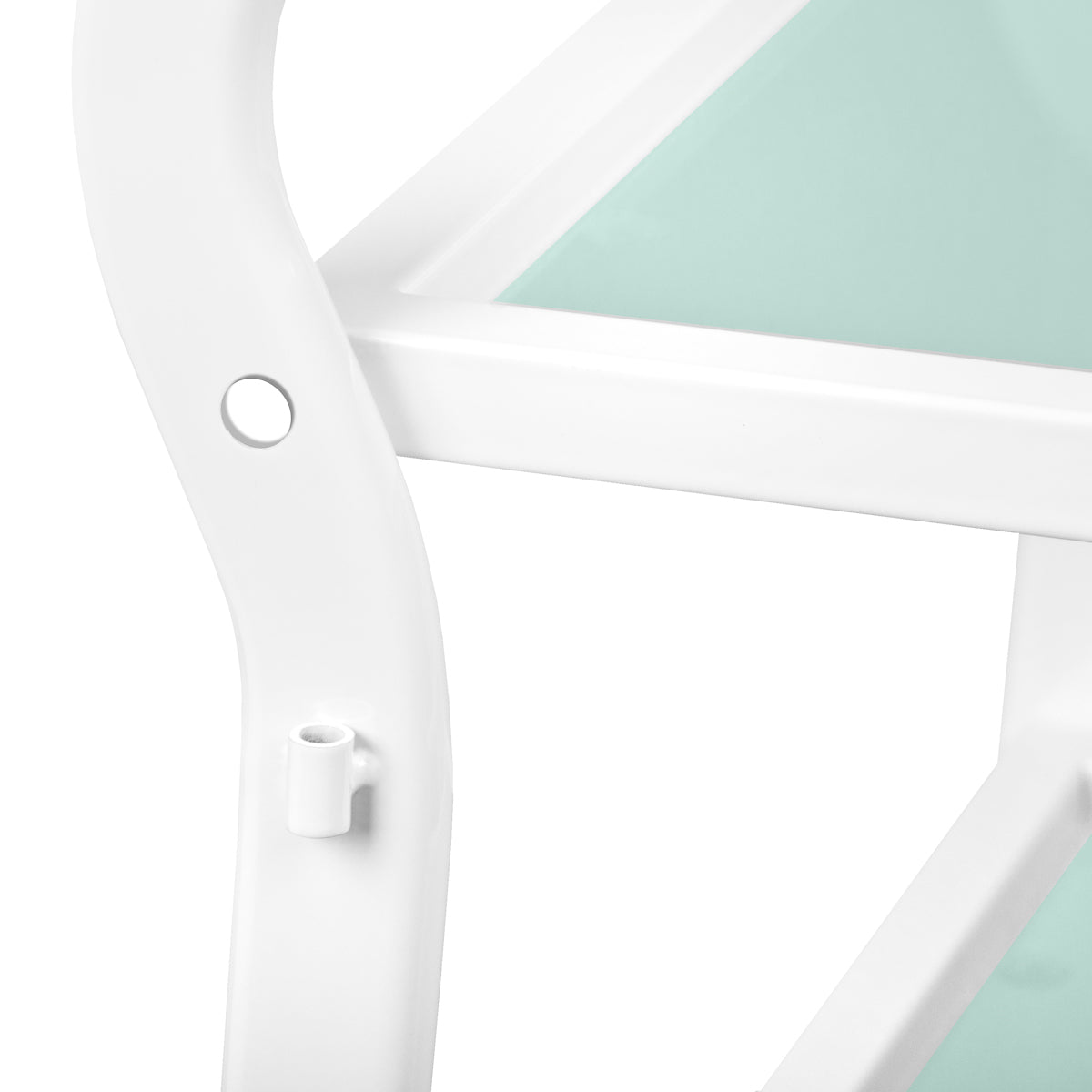 tavolo per dispositivo cosmetico, realizzato in metallo e vetro, con ruote. ha tre ripiani in vetro.