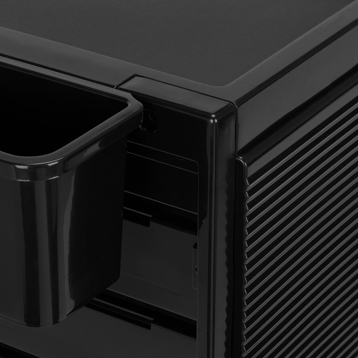 In cima all'aiutante c'è una rientranza poco profonda, che sarà ottima per riporre gli strumenti mentre lavori. Sarà anche un ottimo posto per mettere gli accessori più necessari durante il servizio – come nel caso della colorazione – ciotole, tinture o pennelli. La superficie della rientranza – come tutti i vassoi del set – è coperta da uno strato opaco, ruvido e antiscivolo, grazie al quale ammortizza e mantiene gli strumenti posizionati in un dato posto.