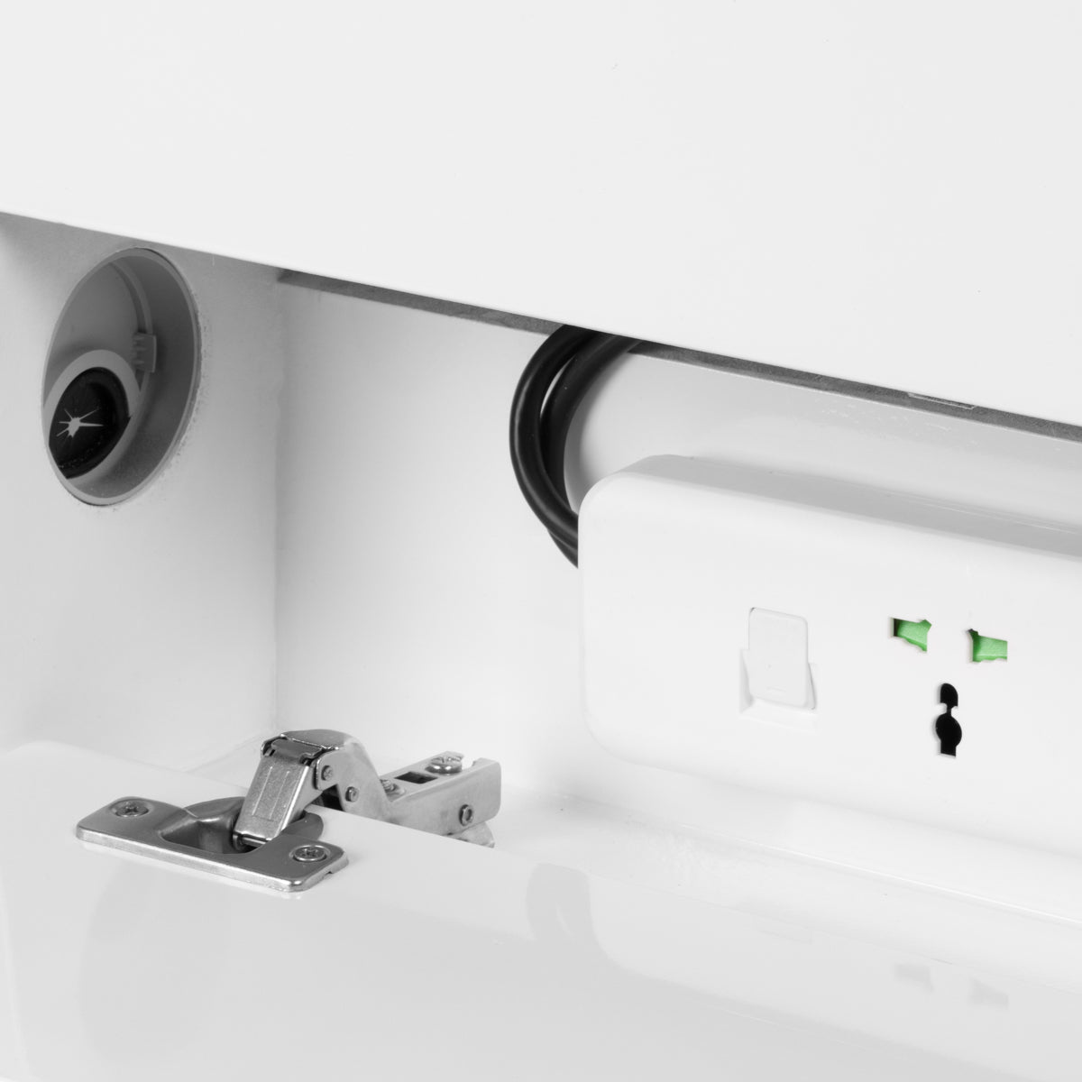 Un assistente podologico di alta qualità è un mobile cosmetico funzionale su ruote. Grazie alla sua mobilità, puoi trasportarlo in altre stanze di trattamento. L'assistente ha un piano di lavoro in vetro, cassetti per strumenti, accessori e una mensola per una fresatrice podologica o altro dispositivo. Un cassetto è dotato di una lampada UV-C integrata per una migliore sterilità di strumenti e accessori.