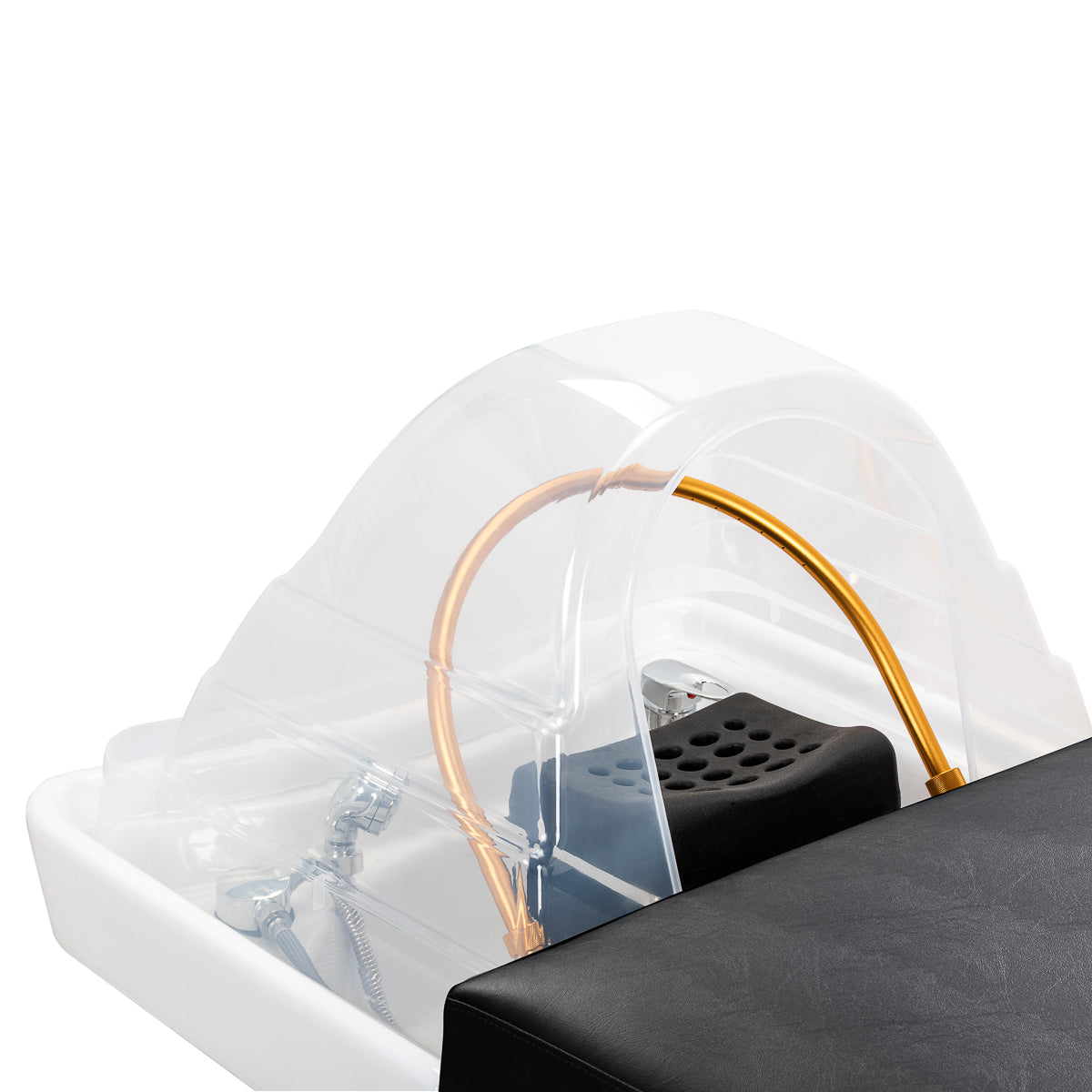 Una profonda vasca in ceramica in tonalità di bianco riduce efficacemente gli schizzi d'acqua e dei prodotti utilizzati durante i trattamenti, garantendo pulizia e comfort di lavoro. Realizzata in materiale resistente, la vasca è resistente a scolorimenti, graffi e danni, e la sua superficie liscia rende la pulizia eccezionalmente facile. Il suo profilo distintivo non solo facilita l'accesso per la persona che esegue il servizio ma dona all'unità lavaggio un aspetto elegante e moderno. La combinazione di estetica e funzionalità eleva lo standard di qualsiasi spazio professionale.