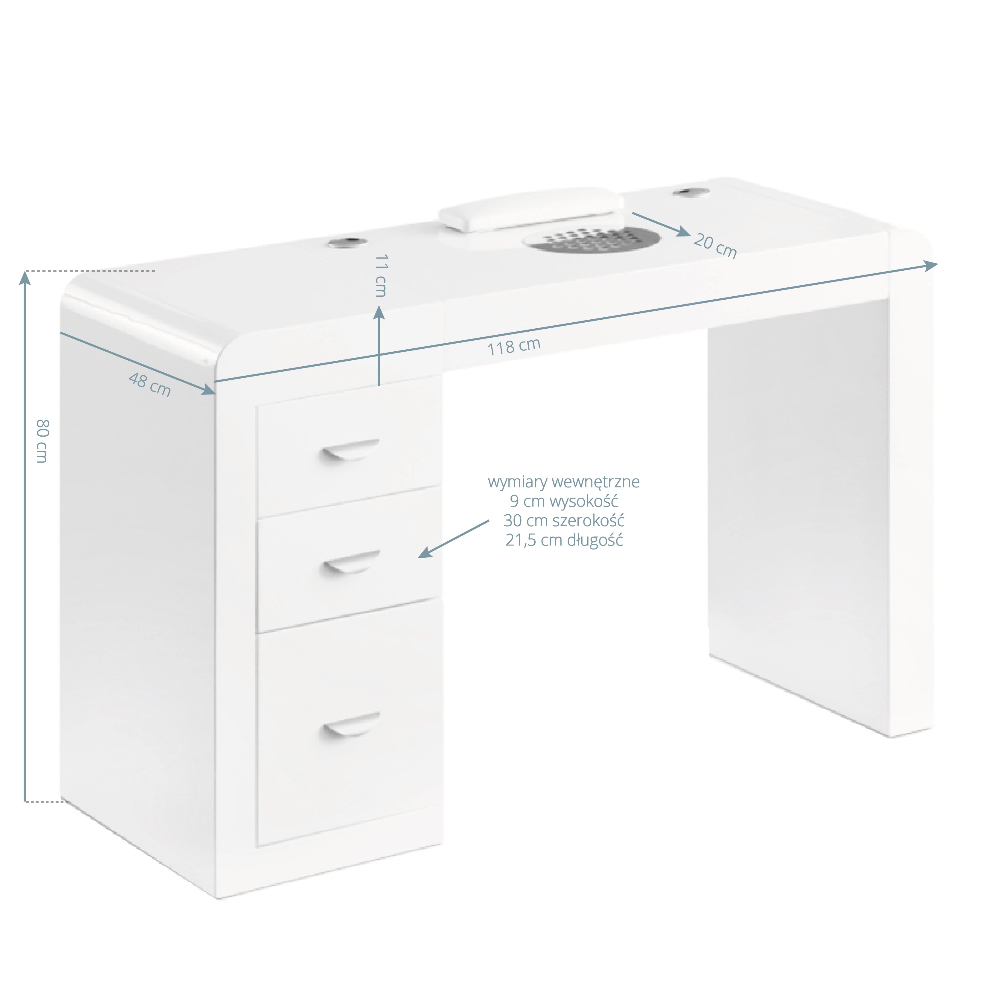 Tre ampi cassetti facilitano l'organizzazione e il mantenimento in ordine dei cosmetici e degli strumenti più necessari. La scrivania è dotata di un pratico assorbitore che riduce efficacemente la quantità di polvere nociva, garantendo aria pulita e fresca nel luogo di lavoro. Allo stesso tempo, grazie alla sua integrazione nel piano di lavoro, non occupa spazio prezioso. Posti appositamente progettati per i cavi semplificano l'organizzazione dei dispositivi necessari nel salone, come trapani per unghie, lampade per trattamenti o lampade per unghie, permettendo di nascondere i cavi.