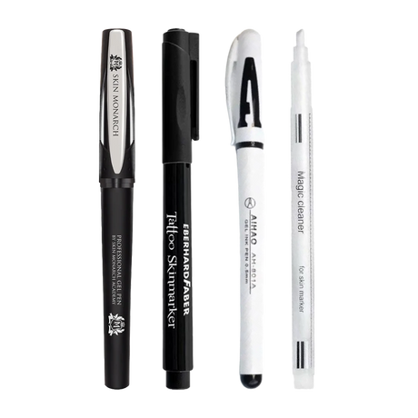 I pennarelli per la pelle, come la White Outline Pen e lo Skin Monarch Gel Sketch Pen (Nero/Rosso), offrono linee nitide e visibili che rimangono intatte durante la mappatura e sono delicate sulla pelle. Questi pennarelli sono perfetti per creare linee guida precise che non sbavano né sbiadiscono durante la tua sessione.