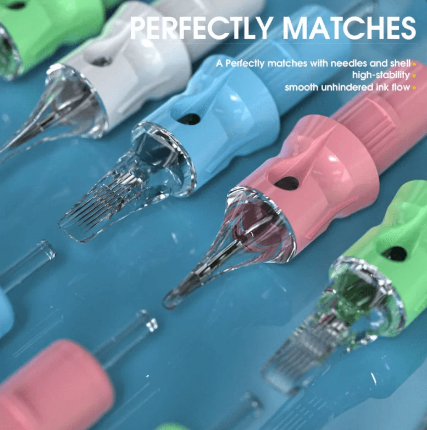 • Materiali di alta qualità: Realizzate con aghi in acciaio 304L, le nostre cartucce sono lucidate a macchina alla perfezione, offrendo durata e prestazioni costanti.