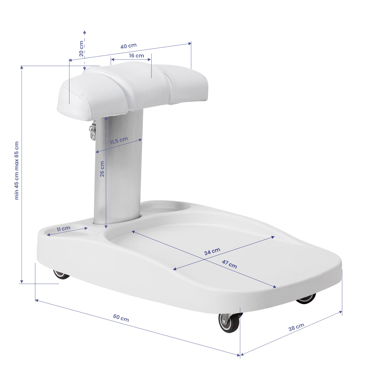 Il poggiapiedi è composto da tre parti, di cui quella centrale è estensibile. La regolazione manuale dell'altezza permette di sollevarlo fino a un massimo di 20 cm. Tutti gli elementi del poggiapiedi sono rivestiti in pelle sintetica, che garantisce resistenza all'umidità e facilità di pulizia. Di conseguenza, il trolley può essere adattato alle esigenze individuali dell'utente, rendendolo una soluzione eccellente sia per trattamenti cosmetici che podologici, assicurando comfort e precisione nel lavoro in varie posizioni.