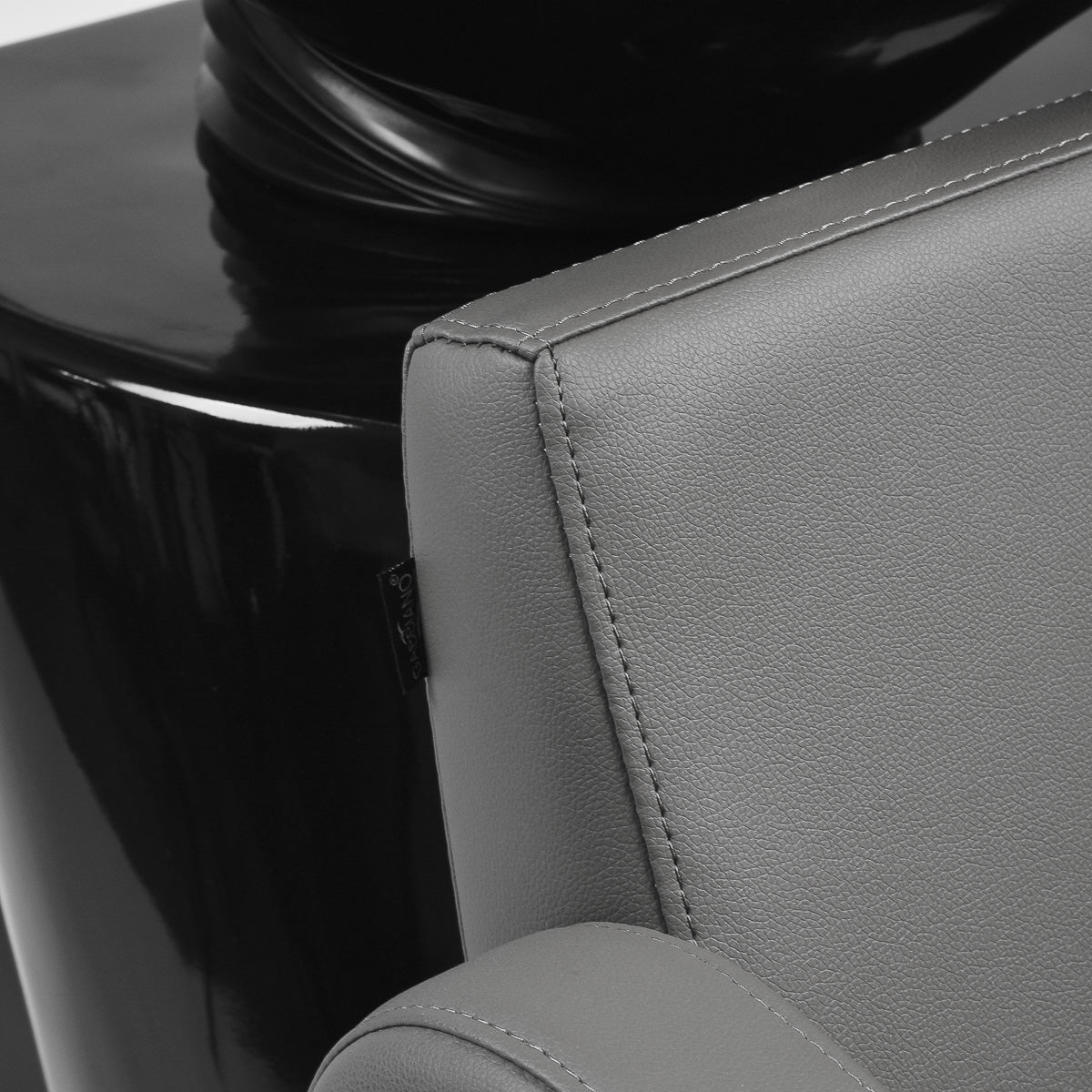 La profonda vasca in ceramica in tonalità di nero riduce gli schizzi d'acqua e dei prodotti usati durante i trattamenti. La regolazione dell'inclinazione della vasca permette la personalizzazione in base alle esigenze individuali, e il materiale utilizzato rende il lavabo resistente, resistente a macchie e graffi e facile da mantenere pulito. Il colletto profilato ergonomicamente offre un comodo supporto per la testa, mentre la morbida copertura in plastica nera elimina la sensazione di freddo dalla superficie in ceramica.