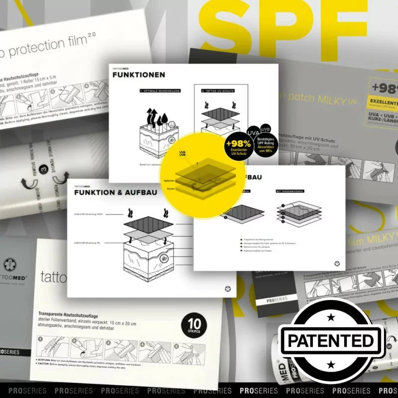 La pelle appena tatuata manca della sua naturale barriera protettiva, rendendola altamente suscettibile a scottature solari e danni cellulari non appena si esce dallo studio. Il TattooMed Protection Patch MILKY agisce come uno scudo affidabile, prevenendo la penetrazione dei raggi UV nocivi nella pelle e supportando una guarigione ottimale. Oltre alla protezione UV, il cerotto protegge da contaminazioni, secchezza, germi e attrito tessile, mantenendo un clima umido della ferita che accelera la rigenerazione e riduce le cicatrici.