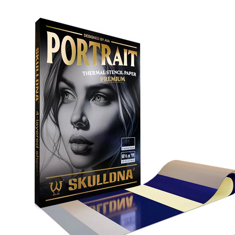 La carta stencil Skull DNA Portrait è realizzata con maestria per tatuatori che richiedono trasferimenti di immagini costanti e di alta qualità, specialmente per lavori di ritratto e dettagliati. Compatibile con tutte le stampanti termiche, questa carta stencil garantisce che i tuoi disegni vengano riprodotti con eccezionale chiarezza e precisione, rendendola ideale per catturare le sfumature sottili e le linee fini essenziali nei tatuaggi di ritratto.