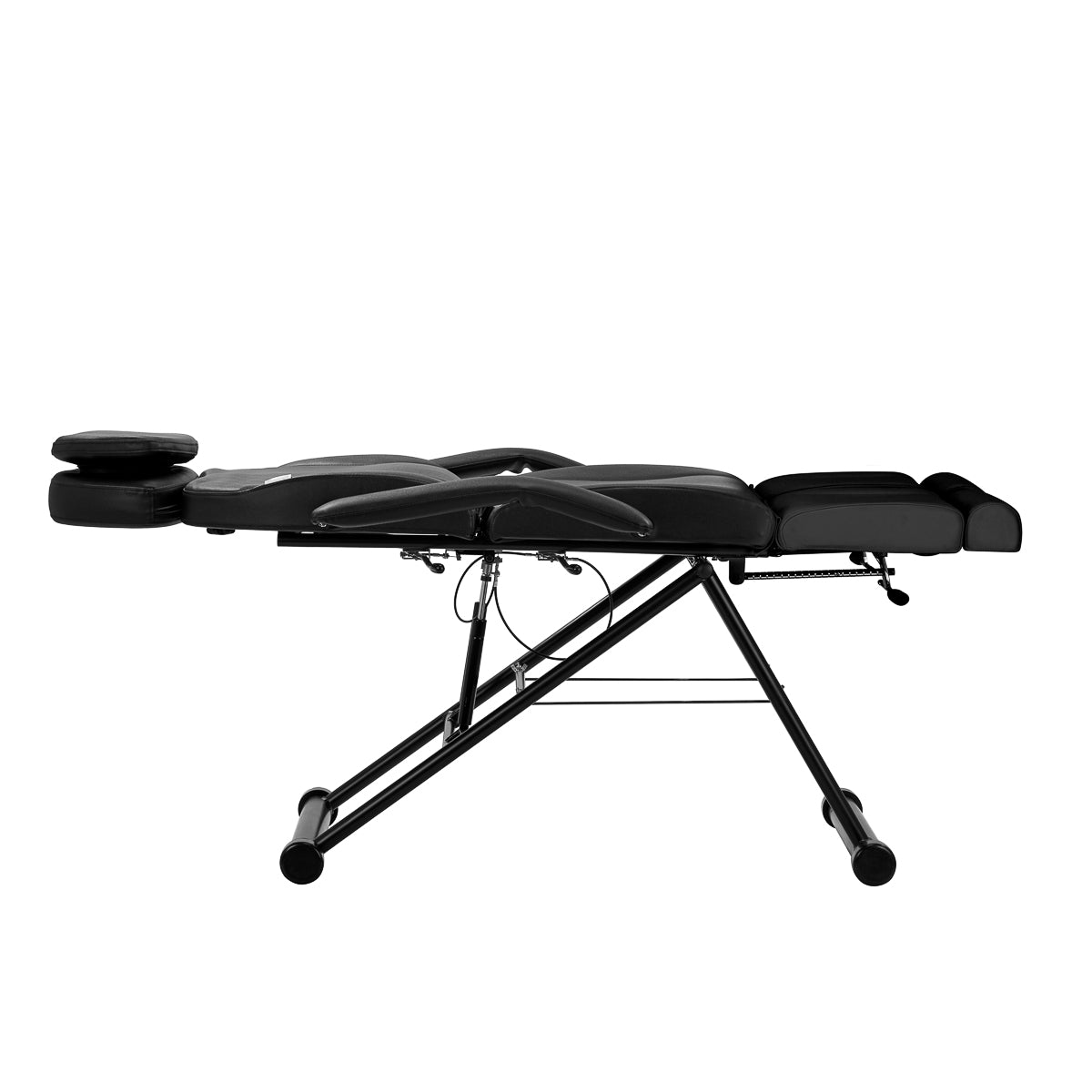 La regolazione degli angoli in cui si trovano il poggiapiedi e lo schienale è fornita da un meccanismo speciale. Usando leve manuali, è possibile regolare liberamente la posizione della sedia. Questo permette una impostazione ottimale in base alle esigenze individuali, per un'esecuzione corretta e comoda dei trattamenti e un alto comfort d'uso. La sedia può essere aperta fino alla posizione di lettino, raggiungendo una lunghezza massima di oltre 2 m, il che ne aumenta significativamente la funzionalità, e insieme all'apertura nel poggiatesta, questo assicura la libertà di eseguire trattamenti del viso e del corpo.