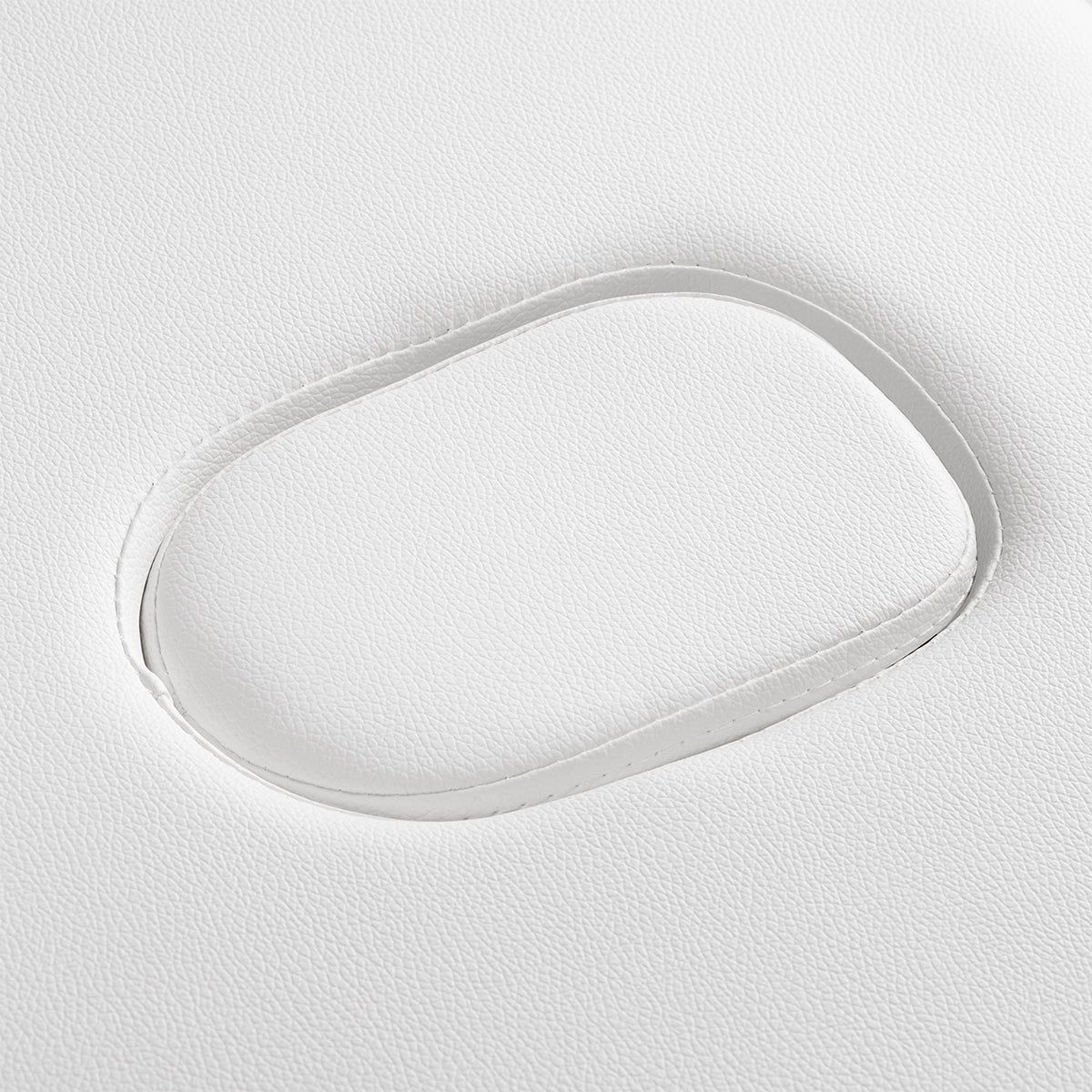 Per garantire il massimo comfort, chi utilizza il lettino può appoggiare la testa su il poggiatesta ergonomico, incluso nel set. Questo elemento è facile da regolare – permette di regolare l'angolo su due piani, il che consente di adattare con precisione la sua posizione alle esigenze dell'utente e alla natura del trattamento eseguito. Per la terapia in posizione supina, il poggiatesta può essere rimosso, utilizzando invece un foro speciale nel piano del lettino. Quando non in uso, il foro può essere coperto con il tappo incluso, ripristinando una superficie dall'aspetto estetico e uniforme.