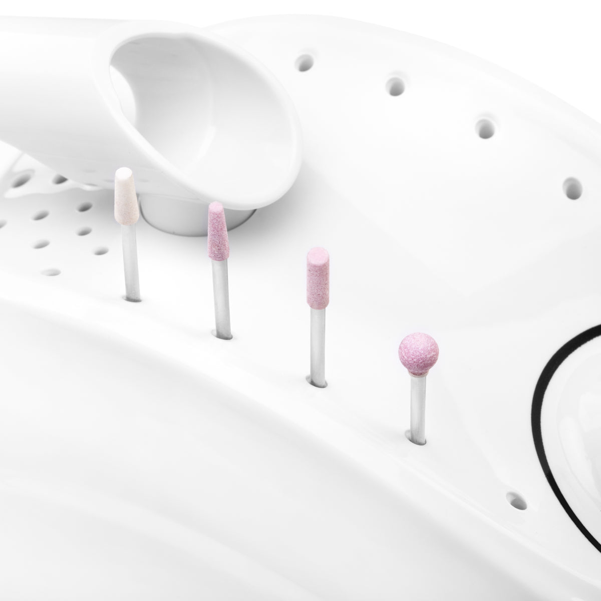 Il manipolo di questo trapano per unghie è davvero solido e raggiunge un massimo di 35.000 giri al minuto. Puoi controllarlo tramite la scatola così come tramite il pedale incluso. Rotazione inversa del manipolo con un solo pulsante, senza necessità di fermarsi. Puoi posizionare il manipolo sul supporto che sarà fissato alla scatola di controllo. La costruzione speciale della scatola permette di inserire le punte nei fori in modo che siano sempre a portata di mano.