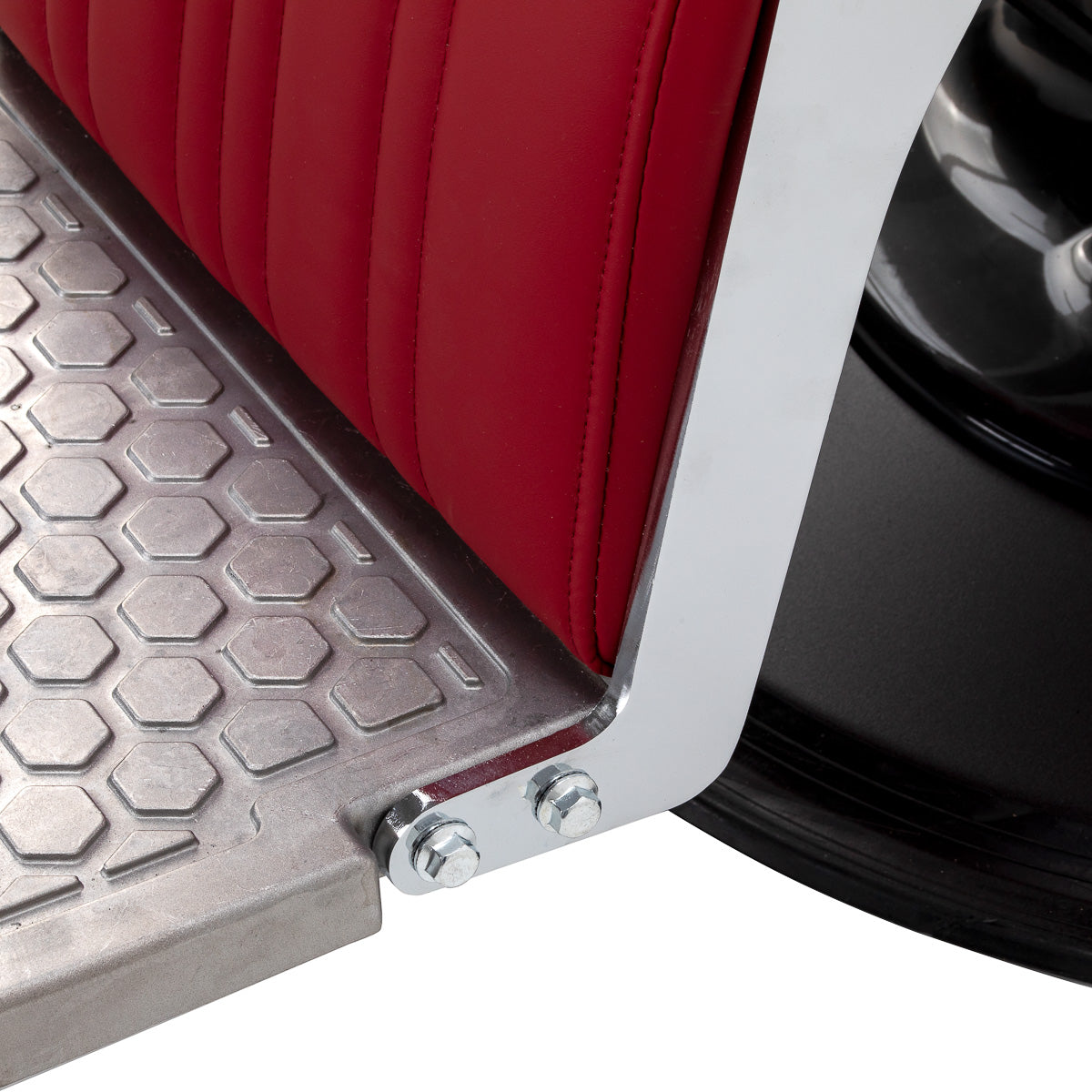 La base stabile fornisce un supporto sicuro e un alto comfort d'uso. Il sedile è imbottito con schiuma resistente alla deformazione e rivestito in pelle sintetica semi-opaca, garantendo durata e comfort a lungo termine. I materiali si distinguono per la resistenza all'umidità e la facilità di pulizia. Il rivestimento bordeaux, abbinato agli elementi in metallo cromato e al poggiapiedi decorativo, conferisce alla poltrona un carattere distintivo e classico. Le cuciture verticali enfatizzano lo stile vintage, che si integra perfettamente nell'atmosfera dei barbieri professionali. I dettagli curati danno all'insieme un aspetto rappresentativo, e il design funzionale favorisce un lavoro confortevole ed efficace.