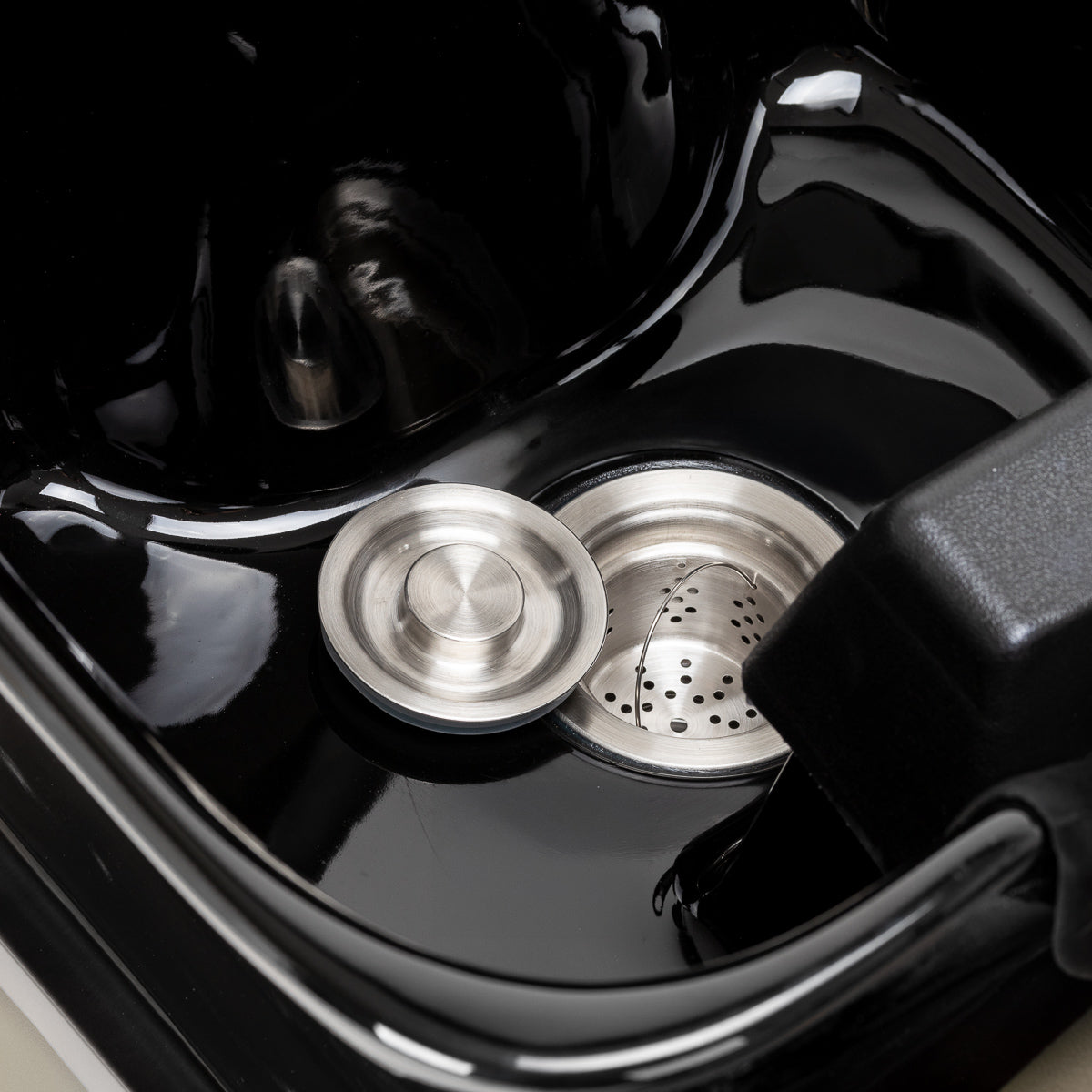 La vasca in ceramica nelle tonalità del nero, con la sua forma moderna e la profondità adeguata, previene efficacemente gli schizzi d'acqua e dei prodotti utilizzati durante i trattamenti, permettendo un'esecuzione comoda ed efficace di un'ampia gamma di servizi. Il colletto profilato correttamente e lo schienale inclinato offrono comfort e supporto durante il lavaggio dei capelli, mentre la copertura in plastica nera protegge il cliente dalla superficie fredda della ceramica, garantendo un'esperienza piacevole durante il trattamento.