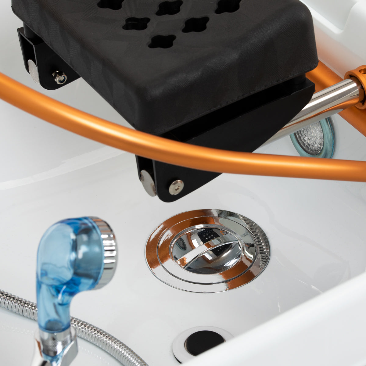L’arco dorato con angolo di inclinazione regolabile, progettato per il Waterfall Head SPA, è una soluzione innovativa che permette una cura completa del cuoio capelluto. I getti d’acqua agiscono come un massaggio naturale, migliorando la circolazione sanguigna, riducendo tensioni e stress e alleviando disturbi come mal di testa e rigidità del collo. Il flusso d’acqua controllato con precisione favorisce la rigenerazione dei capelli e idrata intensamente la pelle. Grazie a un sistema intelligente a circuito chiuso, l’arco preleva l’acqua dalla vasca e la riutilizza, offrendo un massaggio continuo con l’acqua. Una combinazione di tecnologia e relax che sostiene la salute e il benessere dei capelli.