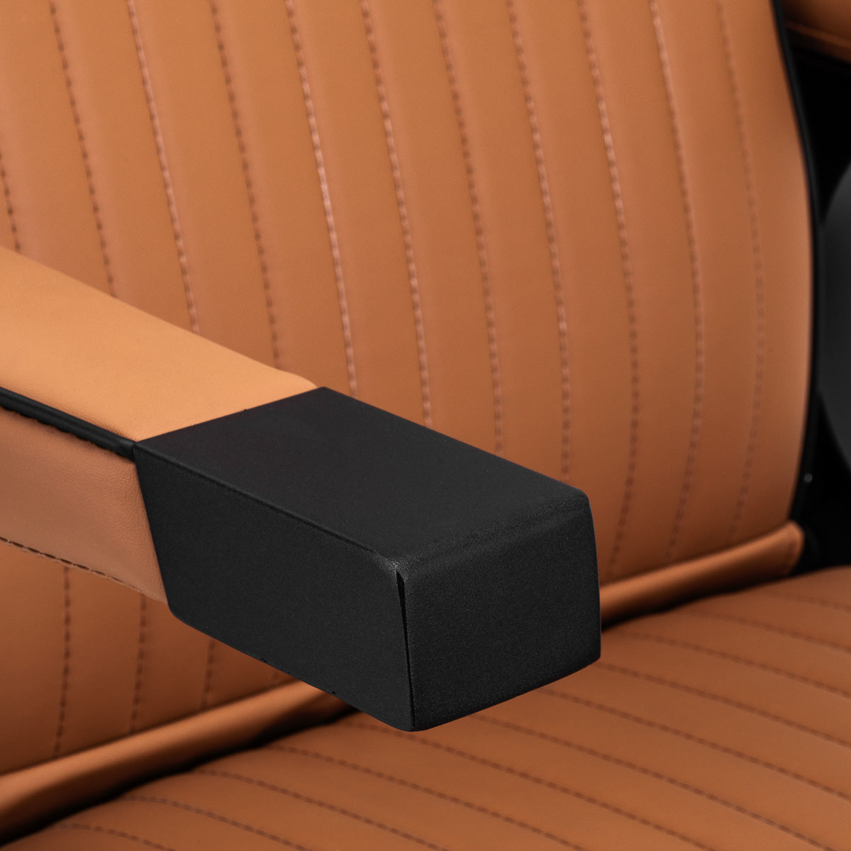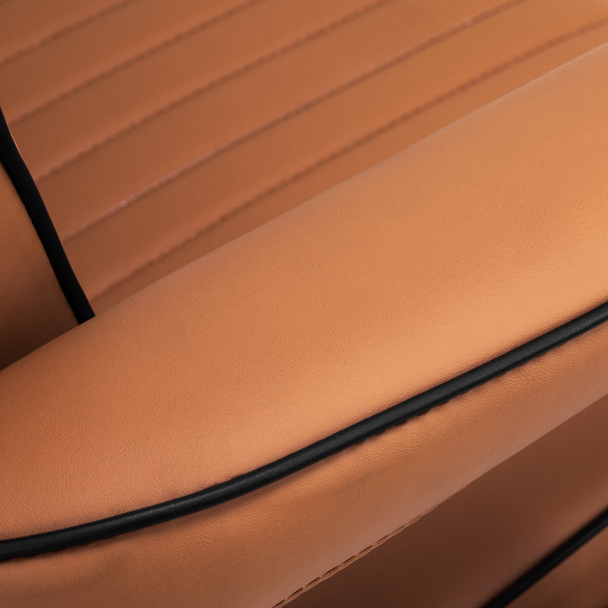 La robusta costruzione della base assicura stabilità e alto comfort. Il sedile è imbottito con schiuma resistente alla deformazione e rivestito con morbida pelle sintetica opaca, combinando durata e comfort. I materiali utilizzati per la finitura sono resistenti all'umidità, durevoli e facili da pulire, rendendo la sedia perfetta per l'uso quotidiano. Cuciture eleganti e tappezzeria in tonalità di marrone le conferiscono un carattere unico, integrandosi perfettamente con l'arredamento dei moderni barbieri.