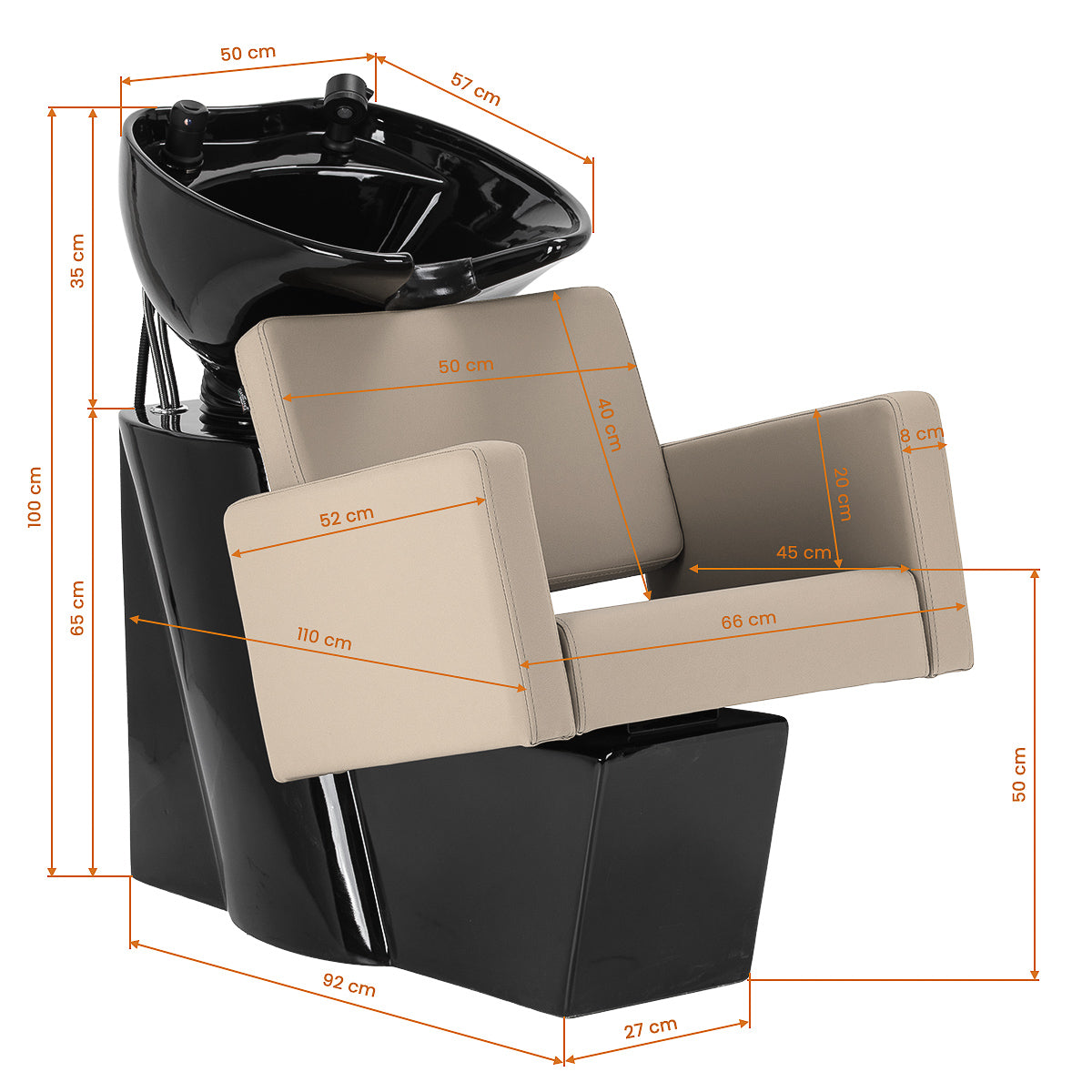 La poltrona dalla forma geometrica unisce semplicità moderna e comodità d’uso. Il sedile e i braccioli dalle linee morbide creano un insieme armonioso, garantendo una posizione comoda durante i trattamenti, mentre lo schienale con angolo di inclinazione ottimale sostiene una postura corretta e favorisce il rilassamento. La tappezzeria in pelle sintetica di alta qualità nelle tonalità di grigio e beige è resistente all’uso e all’umidità, oltre che facile da pulire. La forma semplice e moderna dell’arredo sottolinea il carattere elegante del lavatesta, e gli accessori completi – miscelatore, doccino e tubi dedicati – offrono un set completo di strumenti per il lavoro.