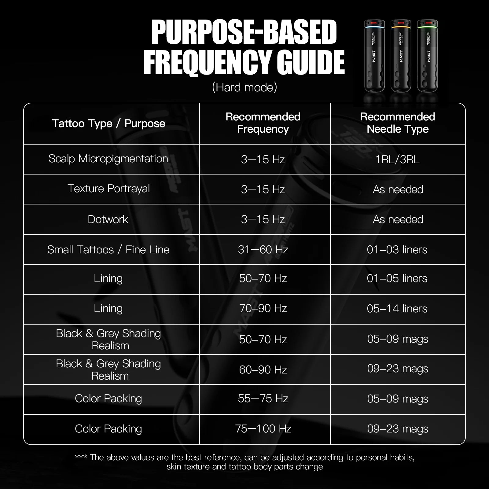 La corsa di 4,2 mm garantisce colpi di ago puliti e solidi, ideali per linee, sfumature e riempimenti di colore - una configurazione affidata dai professionisti che richiedono sia velocità che precisione. Alimentata da una batteria da 1520mAh, offre fino a 5 ore di funzionamento continuo, e con la base di ricarica ultra-rapida Mast, puoi caricare per soli 5 minuti per ottenere 1 ora di autonomia - o raggiungere una carica completa in meno di un’ora.