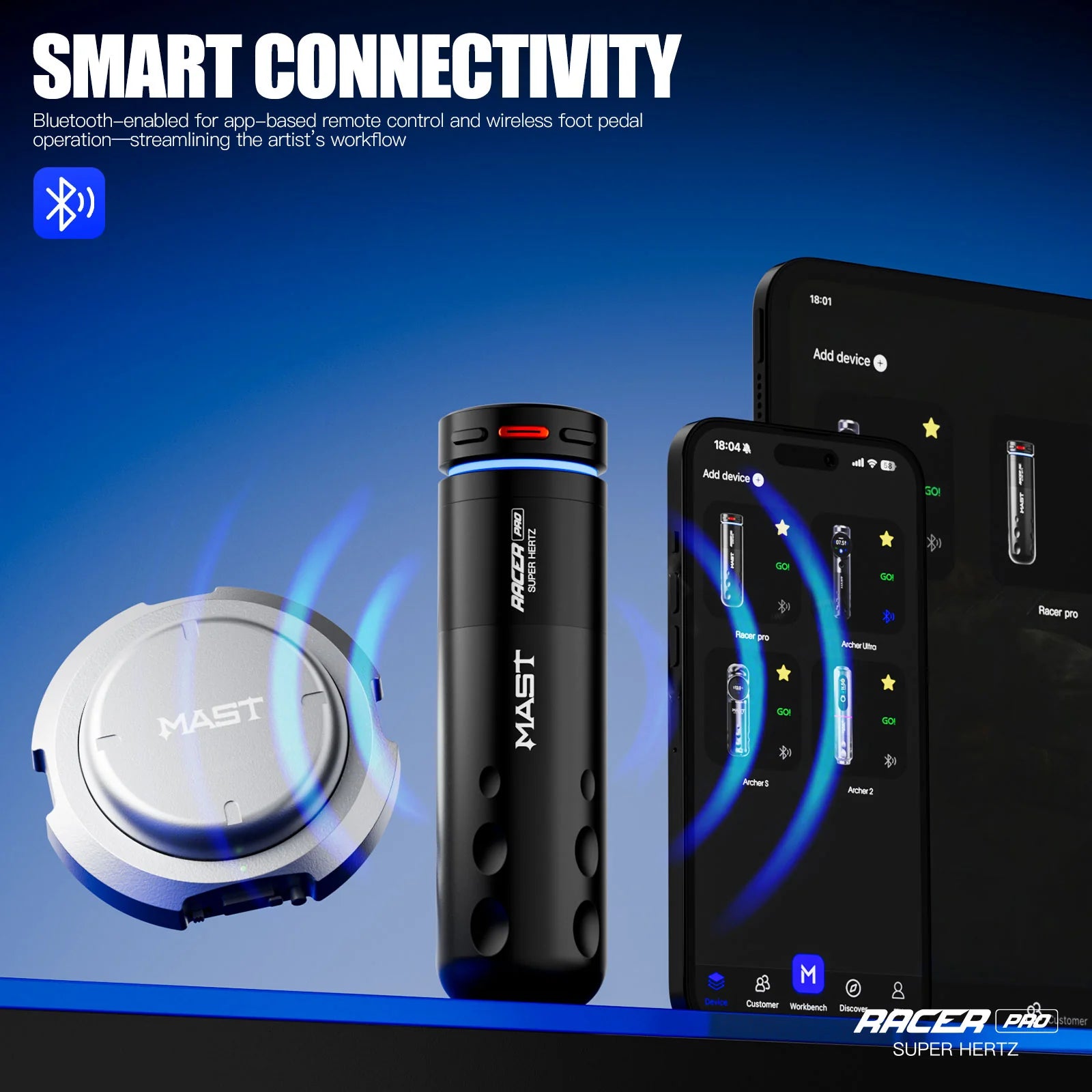 Dotata di connettività Bluetooth, supporto per pedale wireless e un display a colori HD nitidissimo da 0,85”, la Mast Racer Pro mette il pieno controllo nelle tue mani - permettendoti di concentrarti sull’arte, non sull’allestimento. Costruita per durare, leggera e progettata per la precisione, è il nuovo standard delle macchine per tatuaggi wireless professionali.
