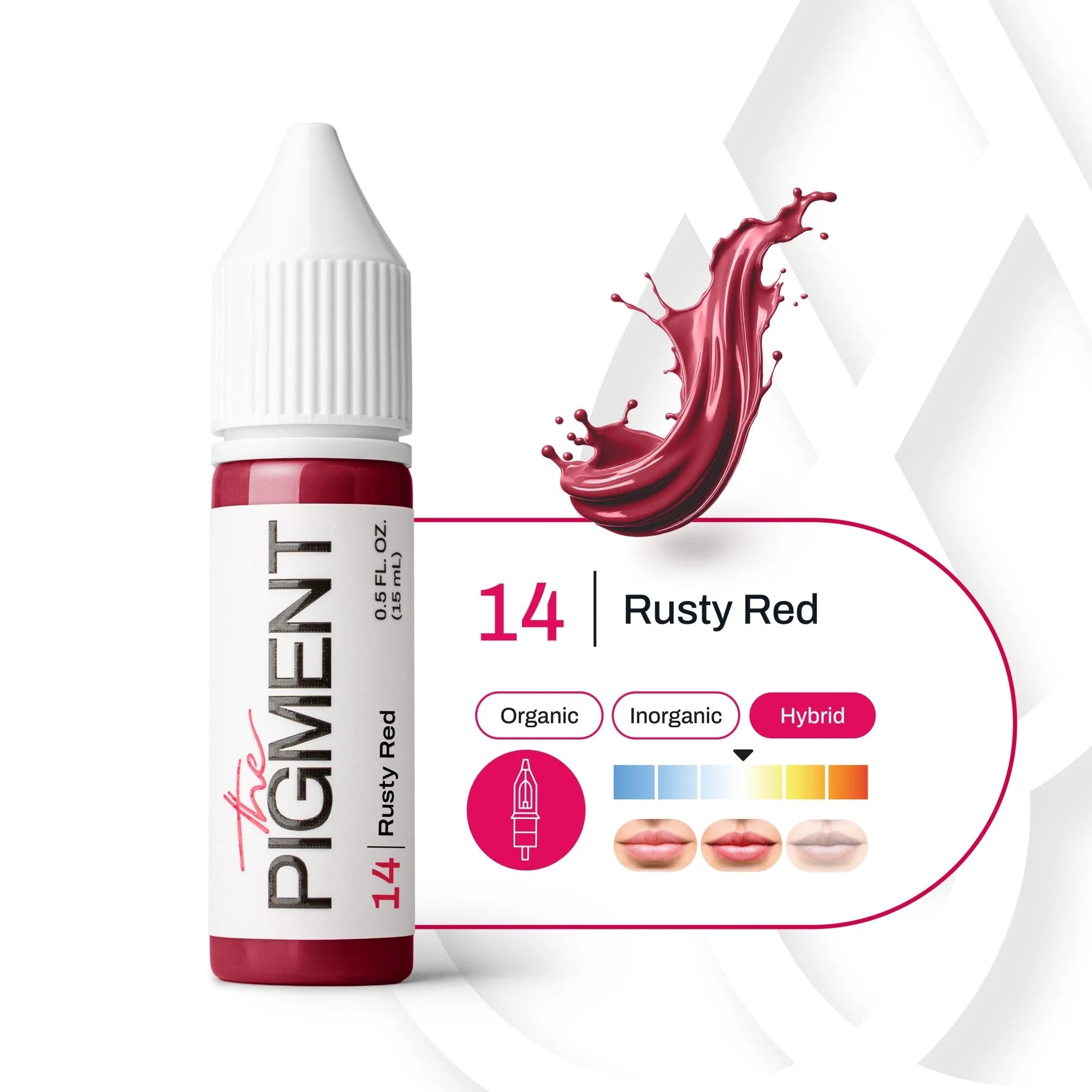 14 Rusty Red è un pigmento per labbra ibrido caldo con un sottotono rosso terroso ispirato al calore naturale della terracotta. Questa tonalità offre un rosso ricco e sicuro con un carattere rustico morbido - ideale per artisti PMU che creano risultati espressivi ma naturalmente equilibrati sulle labbra.