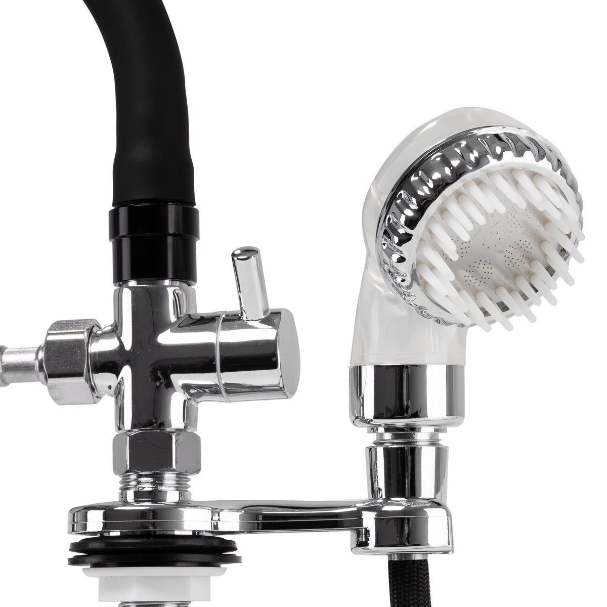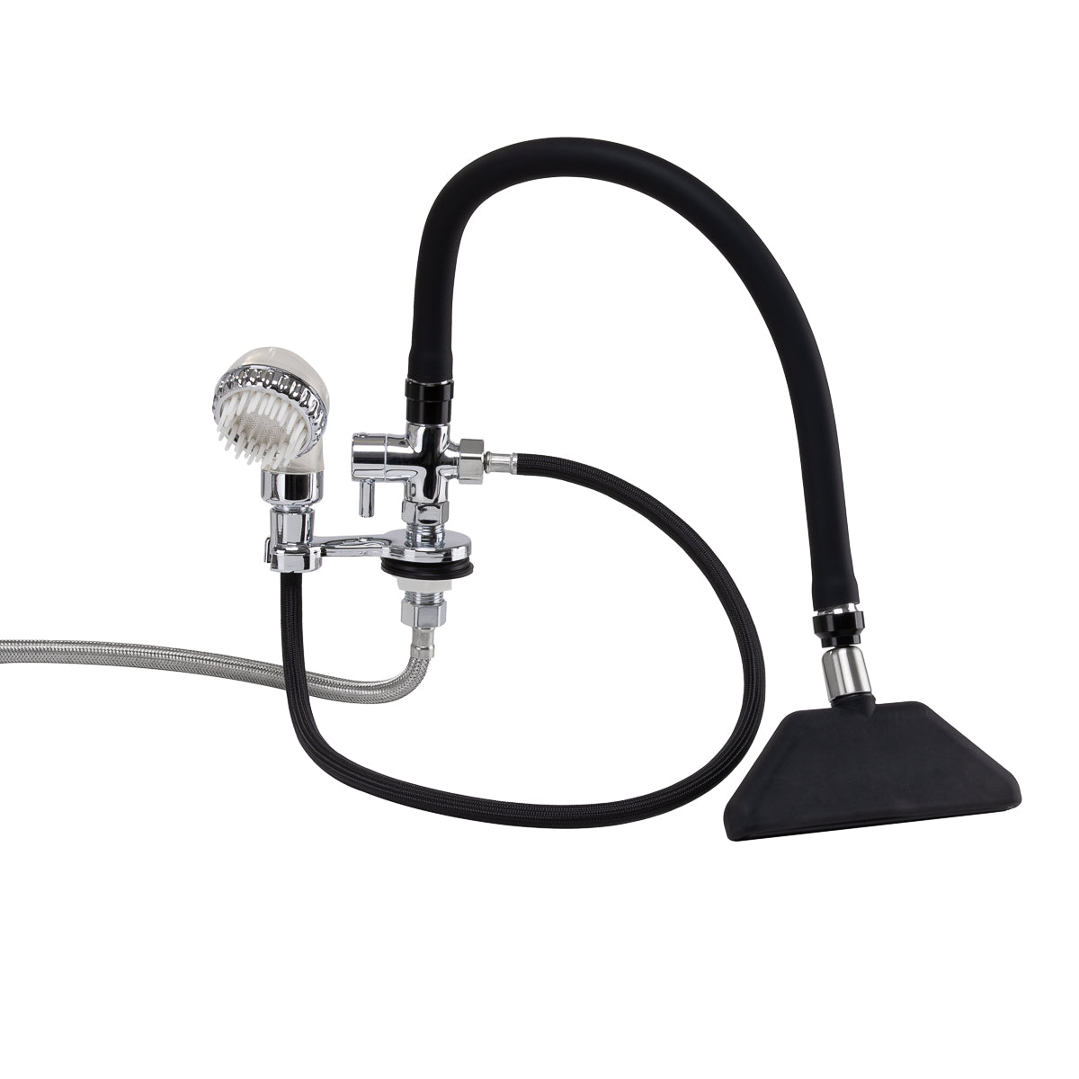 Rubinetto a cascata con miscelatore, progettato per lavatesta da parrucchiere, è una parte indispensabile dell'attrezzatura professionale del salone. Facilita il collegamento comodo dell'acqua al lavaggio e offre comfort sia al parrucchiere che al cliente. Grazie ai tubi di collegamento in acciaio intrecciato inclusi, il rubinetto si caratterizza per alta durata e resistenza all'abrasione.